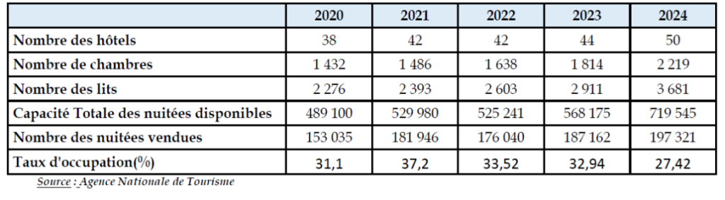 Le secteur comptait, en 2023, 44 hôtels pour un total de 1 814 chambres, toutes ne correspondant pas au standing visé par la stratégie gouvernementale.
